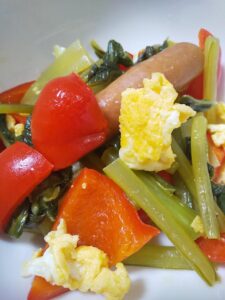 空心菜とパプリカ、ウインナーを炒めて、炒り卵も作って合わせてみた。